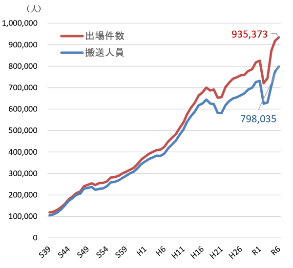 令和6年中の東京消防庁救急隊の出場件数は過去最多を記録し、935,373件でした(前年比+17,062件)。