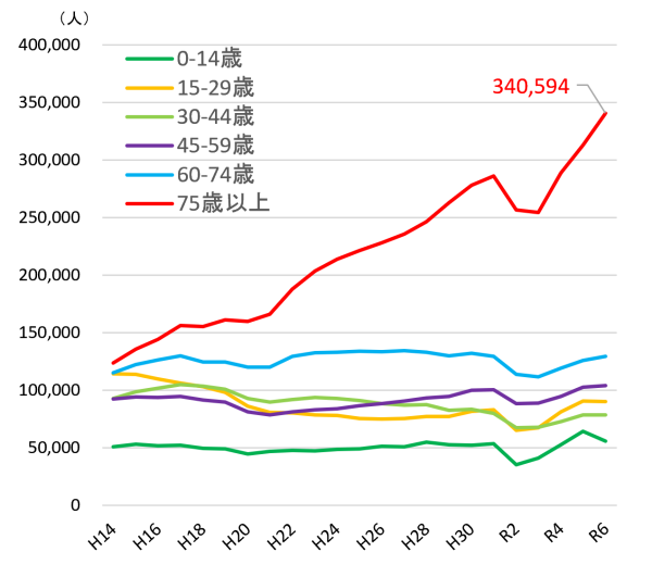 救急需要は、高齢化の進展、疾病構造の変化や都民ニーズの多様化などにより年々増加傾向にあります。特に高齢化の影響は大きく、搬送された方を年代別で比較すると、75歳以上の方が340,594人と、全搬送人員798,035人の3分の1以上(約43%)を占めています。