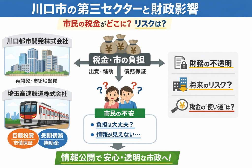 川口都市開発や埼玉高速鉄道など、巨額投資や市債保証を伴う法人を含む第三セクターの情報公開は、